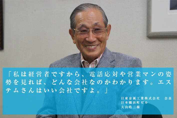 「私は経営者ですから、電話応対や営業マンの姿勢を見れば、どんな会社なのかわかります。エステムさんはいい会社ですよ。」